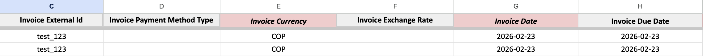 - If you need to issue an invoice with multiple items, ensure that all related rows contain the same value in the “Invoice External Id” field. This will allow the system to group those rows under a single invoice.