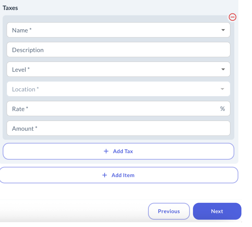 In this step, you define the taxes applied to the item. Click Add Tax and complete: