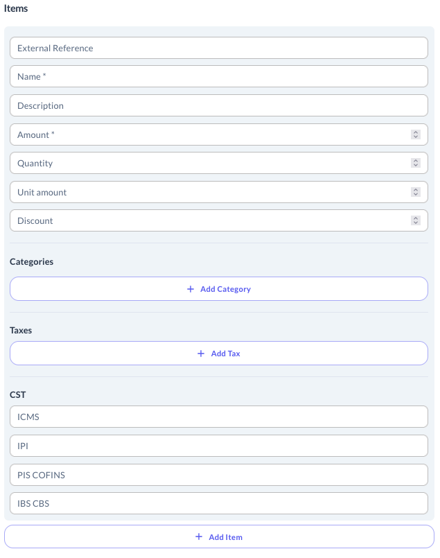 You can use the following parameters for IBS/CBS during the creation of invoices manually on the dashboard: